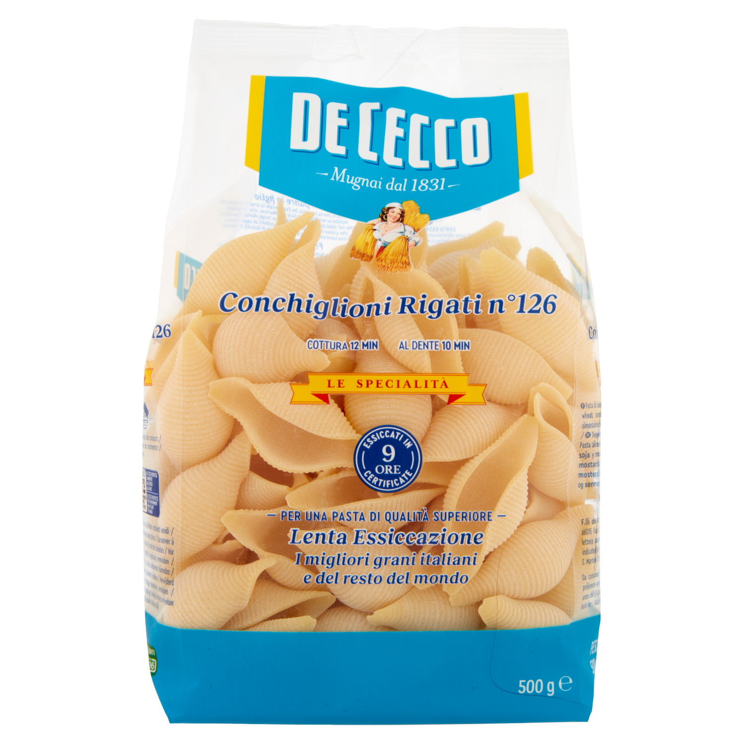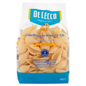 Conchiglioni Rigati numer 126 od renomowanej włoskiej marki De Cecco to efektowny makaron w kształcie dużych muszli, który zachwyca zarówno formą, jak i funkcjonalnością. Każda muszla ma idealnie żebrowaną powierzchnię, dzięki której świetnie zatrzymuje aromatyczne sosy i farsze — ozdobny i praktyczny wybór do zapiekanek, lasagne lub dań z nadzieniem.