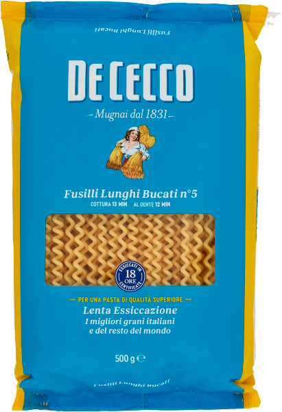Włoski makaron De Cecco Fusilli Lunghi Bucati, produkowany z najwyższej jakości pszenicy durum metodą powolnego suszenia w niskiej temperaturze i formowany przy użyciu matryc z brązu. Zapewnia doskonałą chropowatość powierzchni, która idealnie wchłania sosy.