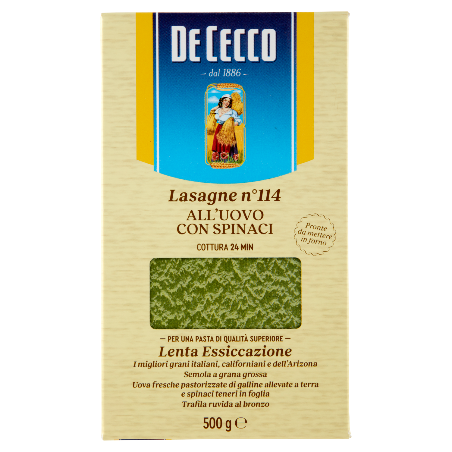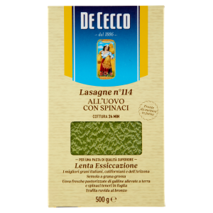 Makaron Lasagne N. 114 marki De Cecco to wyjątkowe połączenie klasyki i nowoczesności. Powstaje według oryginalnej, włoskiej receptury, w której tradycyjny makaron jajeczny wzbogacono o naturalny dodatek szpinaku (10%). Zielone płaty makaronu nie tylko cieszą oko, ale także wzbogacają smak przygotowywanych potraw, dodając im delikatnie warzywnej nuty i eleganckiego wyglądu na talerzu.