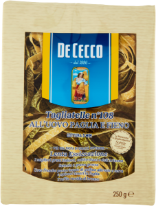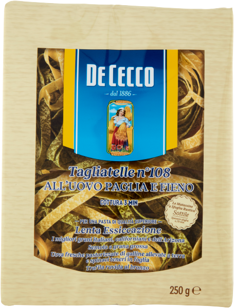 Tagliatelle n° 108 ze szpinakiem to smaczny wariant klasycznego Tagliatelle. Jest wzbogacony mieszanką delikatnych liści szpinaku, co nadaje mu wyjątkowy smak i kolor. Makaron został stworzony z połączenia żółtego i zielonego tagliatelle, co czyni go atrakcyjnym wizualnie na talerzu.